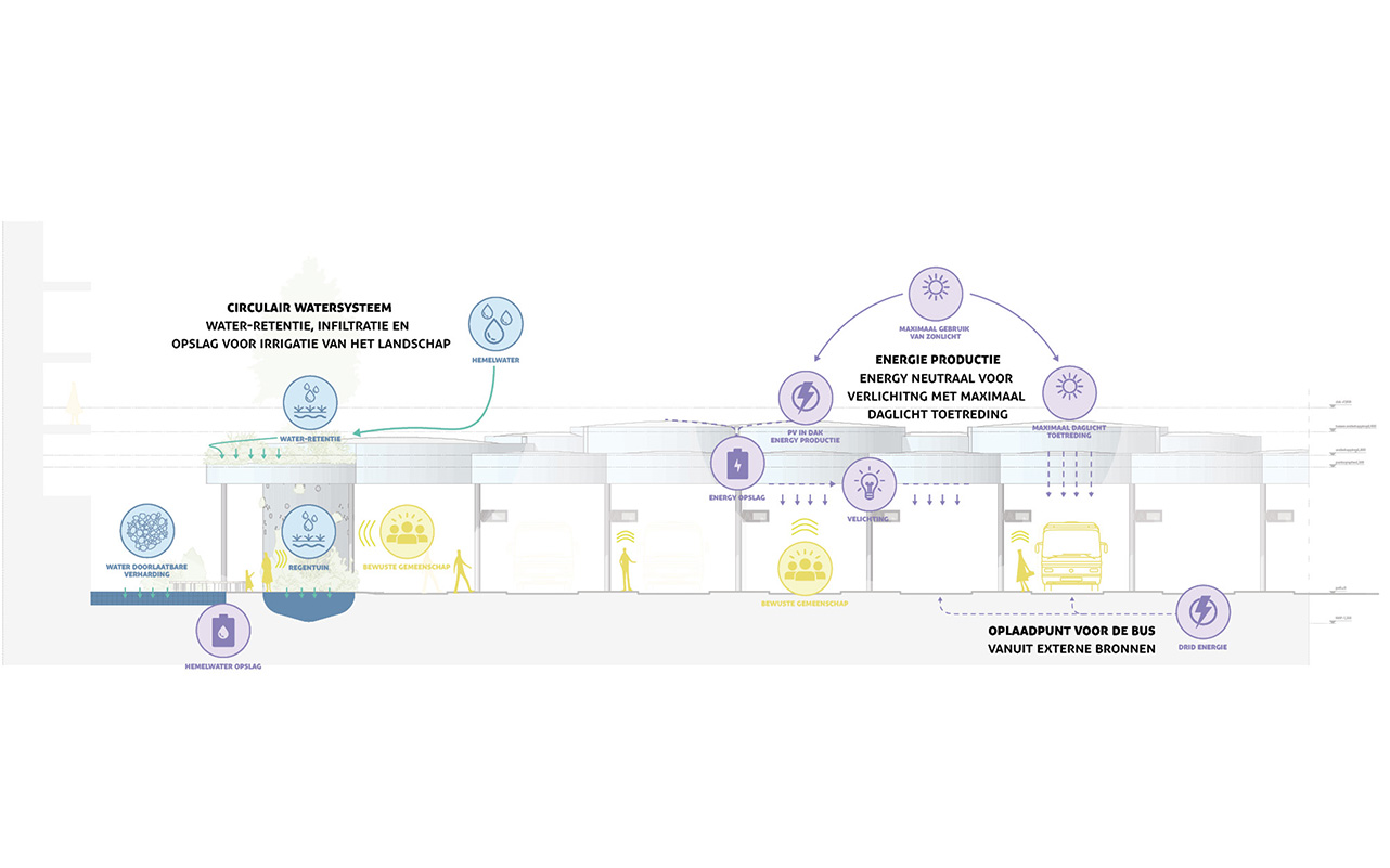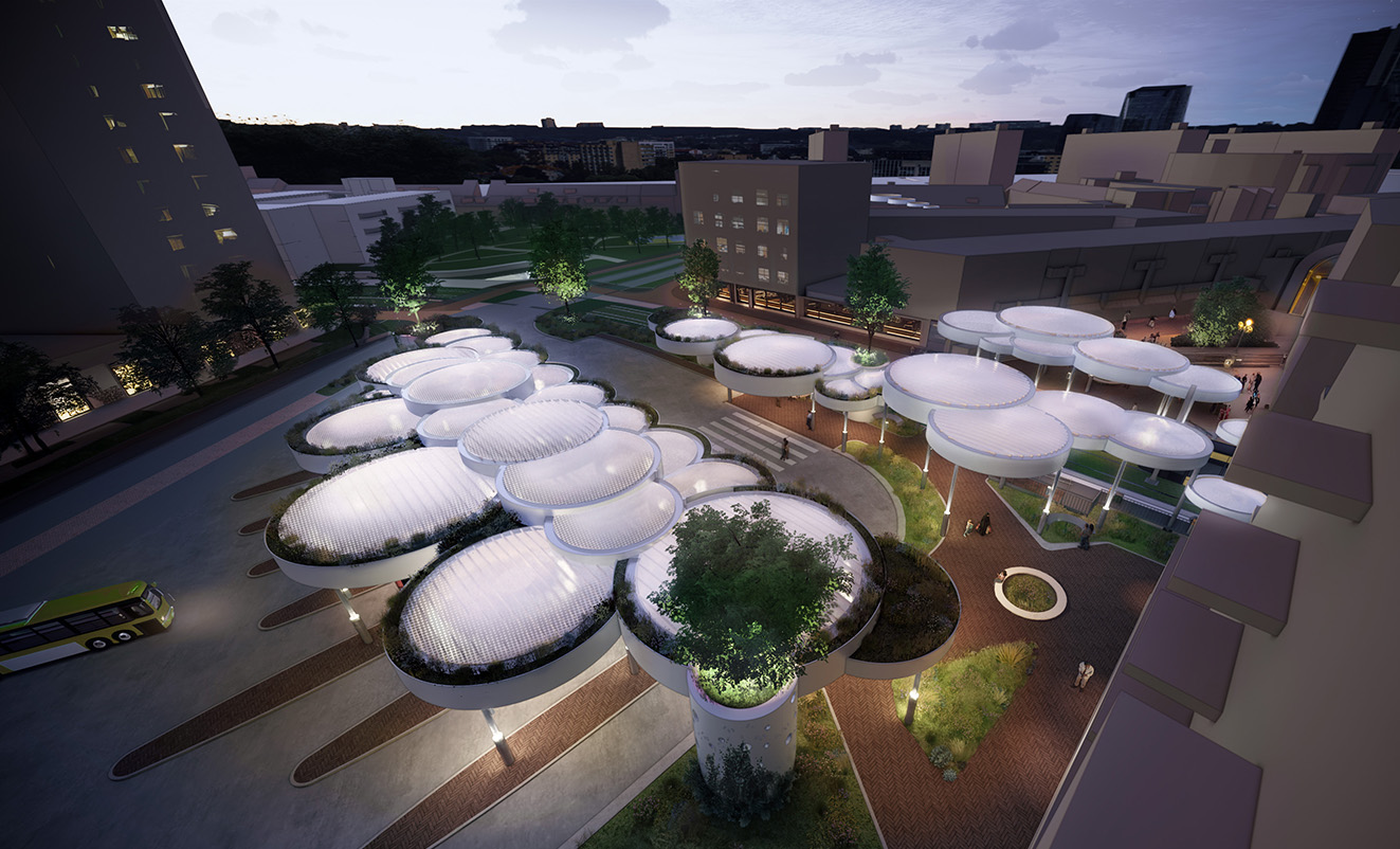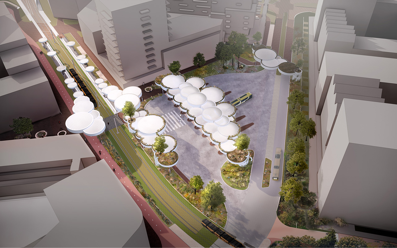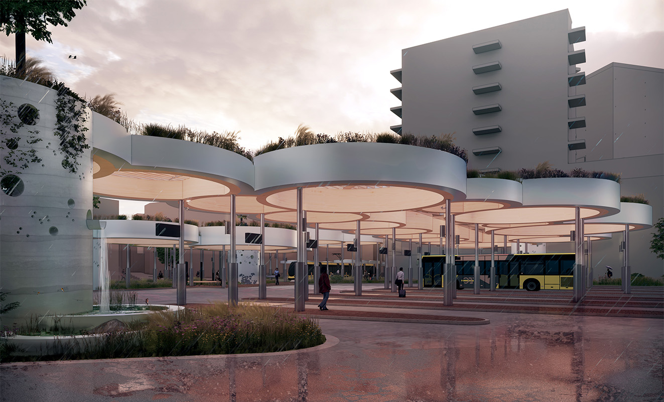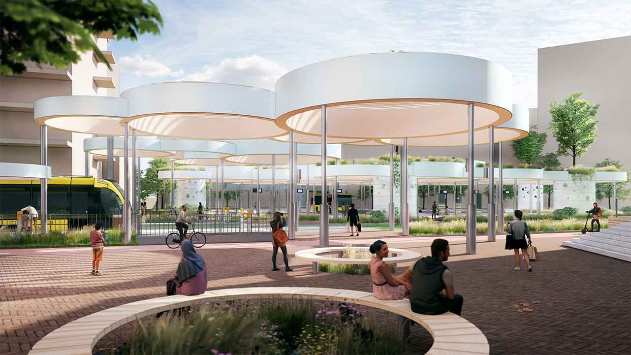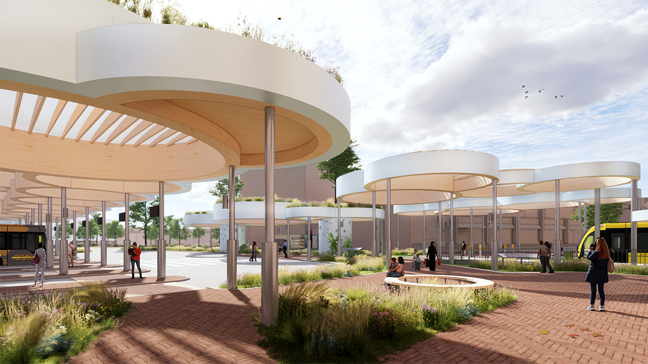 “In the Clouds” is a sustainable and flexible transport hub for Nieuwegein, featuring floating circular wooden canopies that connect city and travelers in a light, welcoming way. Combining natural materials, green integration, and renewable energy, the design creates a future-oriented, adaptable, and iconic public space that reflects Nieuwegein’s ambition for a sustainable urban center.