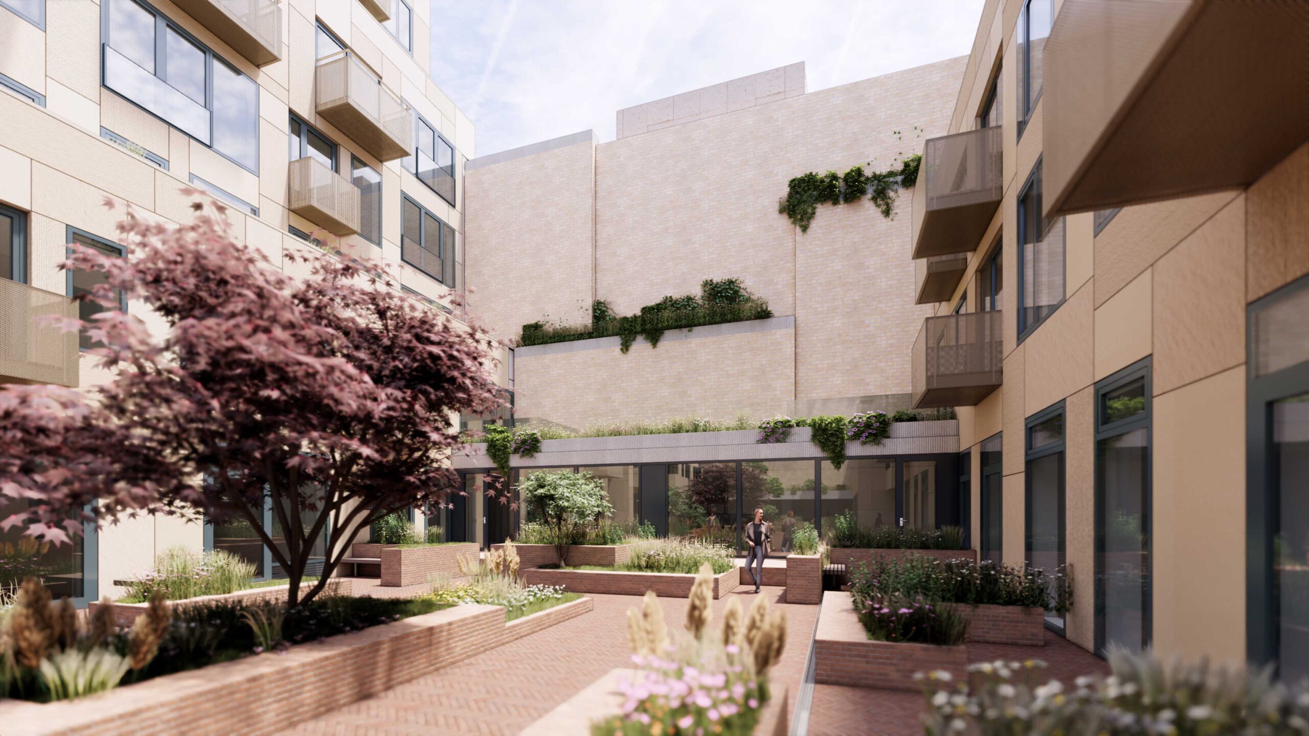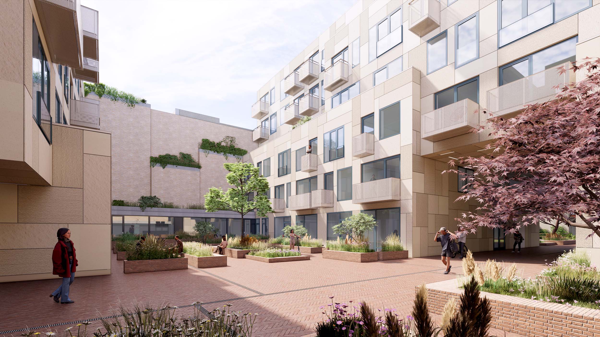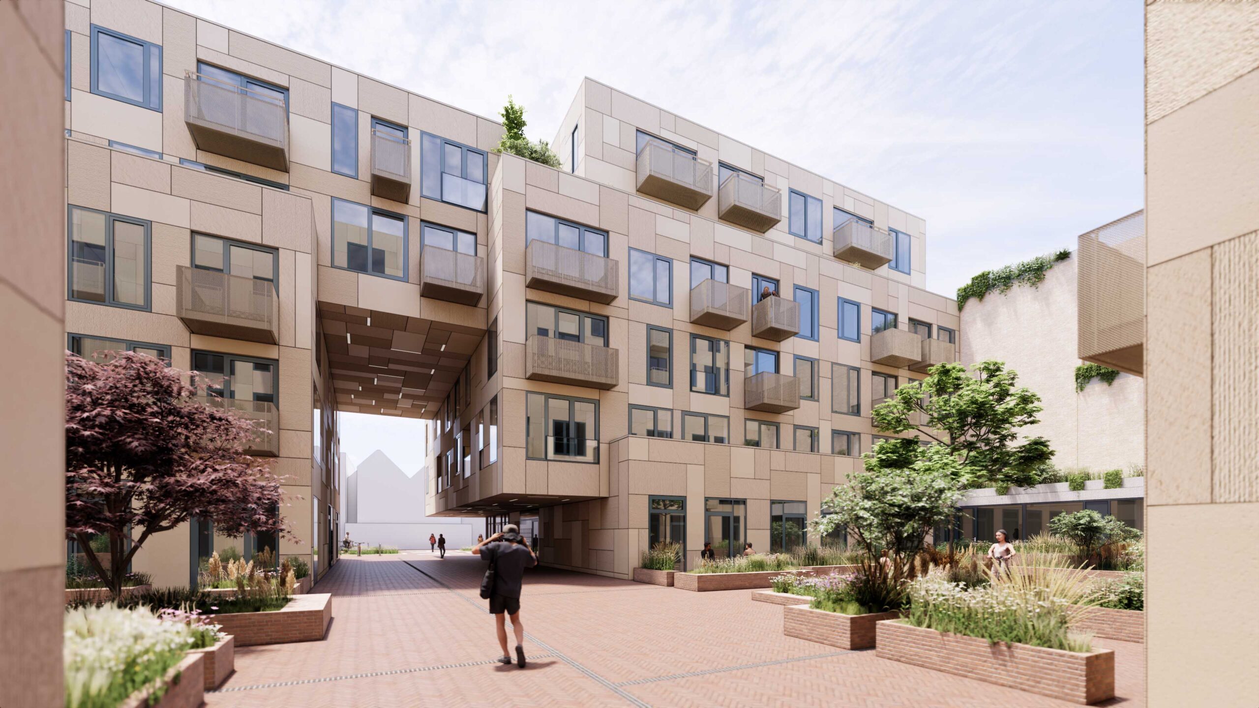 A lifely sculpture to be discovered, where the heaviness defies gravity in form of residential blocks that can be experienced from every corner. Four main blocks are kept separate from each other at ground level, forming a whole cubic sculpture with spacious roof terraces, where the public space and vegetation crawls all over, forming a simbiosis where everything is intertwined.